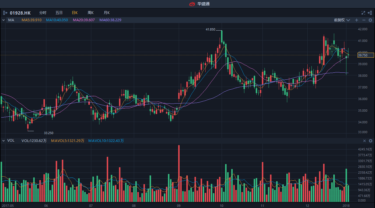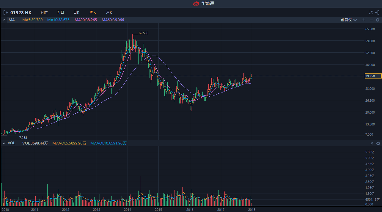 澳门的搏彩业收入自2015年年底回升,而银河娱乐(0027)及金沙中国(1928)的管理层亦在2016年第三季时直言澳门的搏彩业最坏情况已过。虽然贵宾厅的收入无法和2014年时的高位作对比,但随着中场收入的冒起以及向综合旅游渡假村的方面发展,公司的盈利表现亦出现逐步回升的情况。正如早前在经济通推介时所提及,港珠澳大桥通车及澳门威尼斯人酒店的重开,对金沙中国的业绩亦有非常正面的影响。按现时市价$39.70计算,预期2018年市盈率为25倍,蓝筹股之中可算是吸引力不俗。