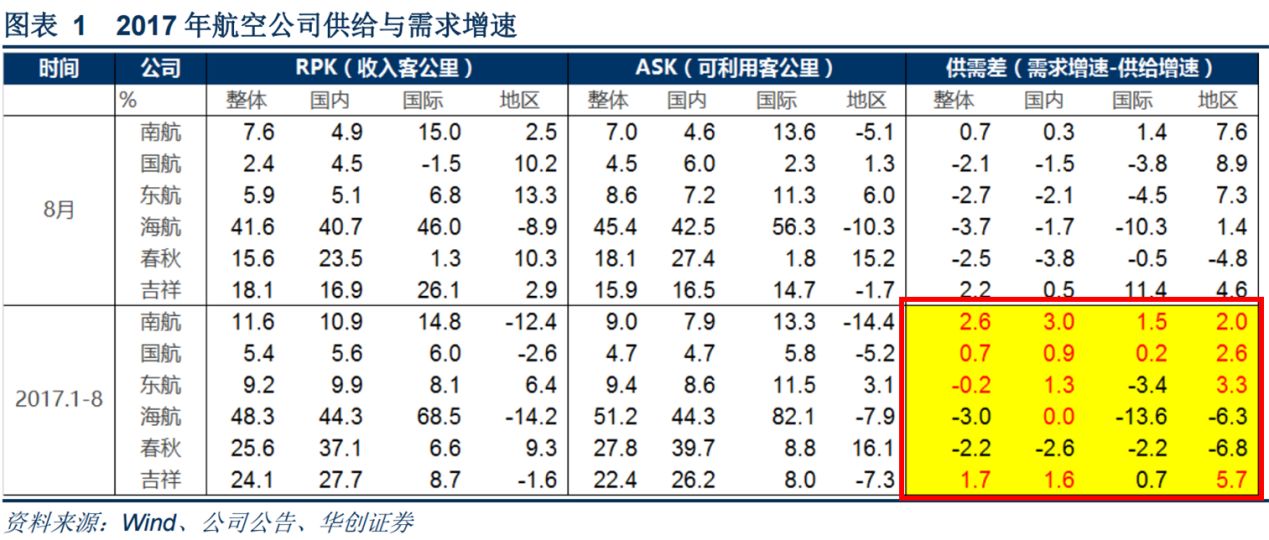 据民航局网站显示,2017年8月,航空的需求增速整体大于供给增速,民航客座率为85.1%,南航、国航和东航客座率分别为 83.9%、82.9%和83.2%,环比提升1.84、1.0和2.1个百分点。