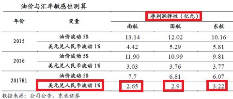 据南航2017年半年报显示,若美元兑人民币汇率变动1%,税前净利润则变动6.3%,即汇率兑换影响系数高达6.3倍