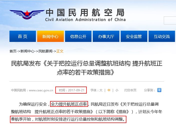 2017年9月21日,民航局又发布《关于把控运行总量调整航班结构提升航班正点率的若干政策措施》。措施提出:从今年冬春航季开始,对航班时刻安排进行运行总量控制和航班结构调整,旨在进一步提升航班正点率,吸引对时间敏感的商务旅客,抢回被中国高铁分流的部分市场。