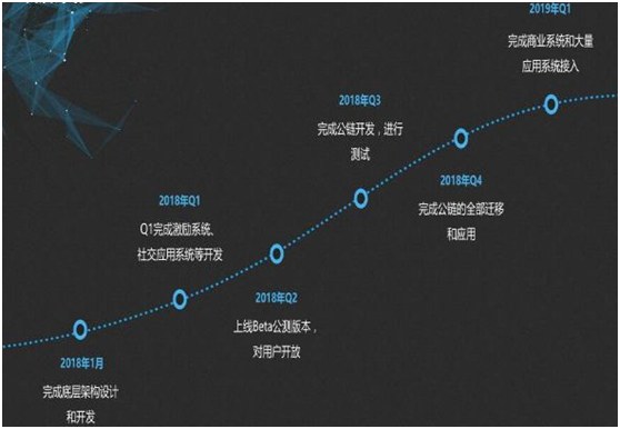 目前,该项目还没有正式实施,只是停留在PPT层面。根据公司的计划,2018年1月开始完成底层架构设计和开发,第一季度完成激励系统、社交应用系统开发;第二季度上线Beta公测版本,对用户开放;第三季度完成公链开发,开始进行测试;第四季度完成公链的全部迁移和应用;直到2019年第一季度,完成商业系统和大量应用系统接入。