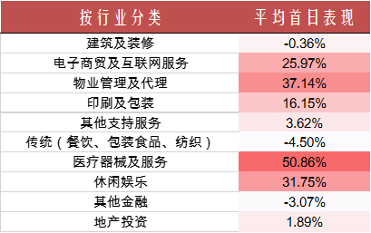 从行业上看,建筑及装修、餐饮、包装食品、纺织、其他金融和地产投资行业的新股表现不佳,投资者应尽量规避,而电子商贸及互联网服务、医疗器械及服务、休闲娱乐、物业管理及代理、印刷及包装等行业新股应重点关注。