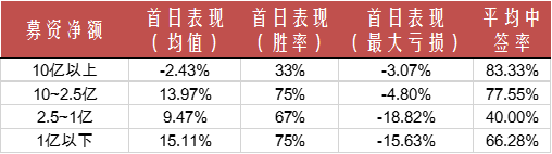 按募资净额分,募资净额在10亿以上的新股首日表现均值为-2.43%,需要我们重点规避。而10亿以下新股呈U型分布,2.5~1亿元的新股表现稍差,而结合最大亏损和中签率一起考虑的话,10~2.5亿募资净额的新股表现最佳。