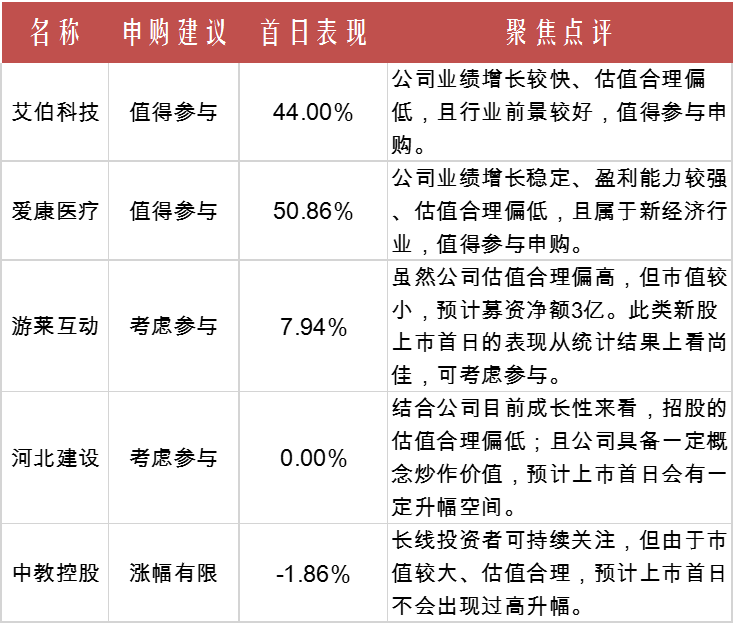本月,华盛学院聚焦了5只新股,成功挖掘爱康医疗和艾伯科技并给予“值得参与申购”点评;并对于热门的国内民营教育龙头中教控股给予了规避建议。比较遗憾的是,市场并没有认同河北建设的投机价值。但总体来说,《新股聚焦》还是保持了良好的记录。