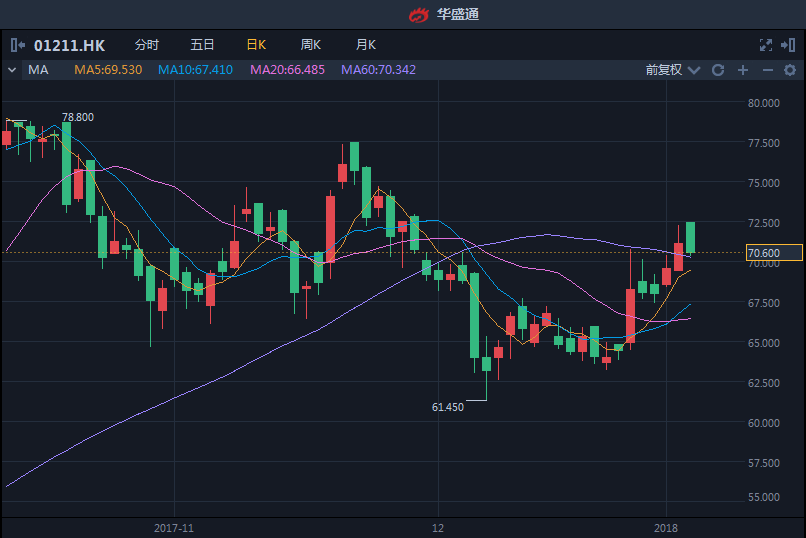 比亚迪闻讯大涨并非无根之萍,经过这两年的发展,新能源老大哥的位置比亚迪越做越稳。公司在1-11月共销售37万辆,其中新能源汽车10.8万辆。中国汽车工业协会数据显示,2017年11月,新能源汽车销量11.9万辆,同比增长83%,月度销量创历史新高;2017年1~11月,新能源汽车销量60.9万辆,同比增长51.4%。由此推算比亚迪在新能源汽车领域市占率20%以上。