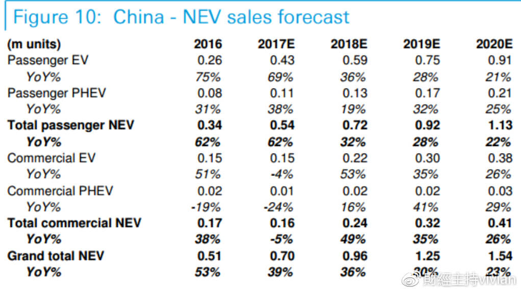 电池的广阔市场与新能源汽车前景广阔密切相关。根据德银最新的研报,预计2017-2020年新能源汽车的涨幅分别为39%、36%、30%和23%。而根据《节能与新能源汽车产业发展规划(2012—2020年)》,目标到2015年,纯电动汽车和插电式混合动力汽车累计产销量力争达到50万辆;到2020年,纯电动汽车和插电式混合动力汽车生产能力达200万辆、累计产销量超过500万辆。