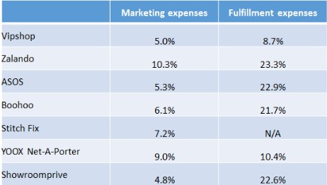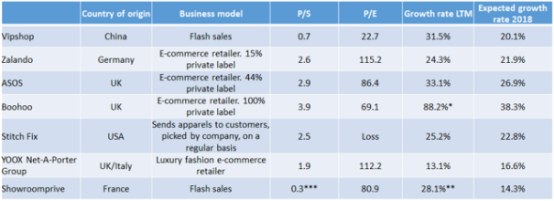笔者选取了已上市的几个服装电商与唯品会进行比较,其中有年营收超50亿美元的欧洲最大服装电商Zalando,年营收超27亿美元的英国最大零售商ASOS,其他还有Boohoo,Stitch Fix以及Showroomprive等公司。
