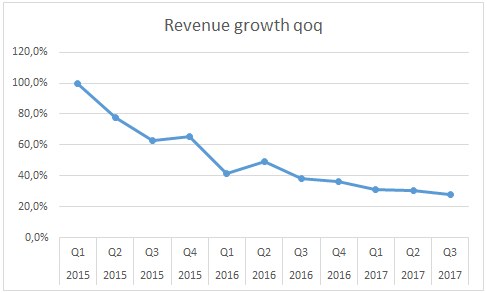 过去几年中,唯品会营收增速从三位数增长放缓至接近30%。对于一家线上服装零售商来说,这样的变化十分典型。唯品会填补了市场的某一空缺,因此在一开始增速极快,而从现在起增速将逐渐与整个市场保持一致。