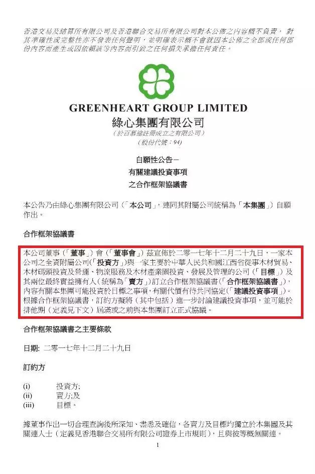 2018年1月4日收市后绿心集团发出了一则自愿性公告,旗下全资附属公司订立合作框架协定,拟投资于一家在江西省从事木材贸易、木材码头投资及营运、物流服务及木材产业园投资、发展及管理的公司,并支付诚意金2,000万元人民币,而最终代价需要进一步磋商。