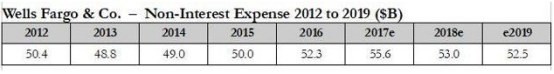 管理层更换后,公司新人CEO Tim Sloan为富国银行设定了到2019年缩减40亿美元非利息开支的目标。假账丑闻之前,富国银行的开支一直在增加。假账丑闻曝光后给公司造成了罚款、处罚和重组成本,如下图所示: