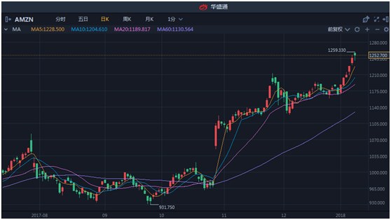 由于在感恩节之后长达5周的假日购物季中,亚马逊的销售额占到了网络购物消费的89%,直接刺激公司股价在进入2018年之后持续上涨。