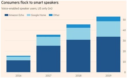 公司2014年推出智能音箱Echo,将智能语音交互技术植入到传统音箱,赋予音箱人工智能属性,通过对话,可以完成点餐、购物、播放音乐等功能,一经推出成为市场人气商品,全球各大公司争相效仿。