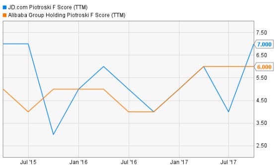 皮尔托斯基分数(Piotroski F Score)选股模型可用于确定公司财务状况稳健程度,并选出最具价值的股票。该模型将股票按照盈利能力、杠杆率、流动性、基金来源以及运营效率的标准进行排列,这是一种有效的选股方法。过去三年中,阿里和京东都曾在不同时间超过对手。根据最新数据,按照上述选股模型分析,得出的结论是京东的评分为7分,比阿里高出一分。