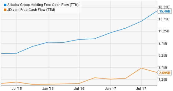 下图是阿里和京东的自由现金流情况,可以看出阿里的自由现金流远超京东,几乎是京东的6倍。不过京东的自由现金流正在快速增长,三年内增速超过500%,而阿里自由现金流三年增速不及京东,仅为132%。