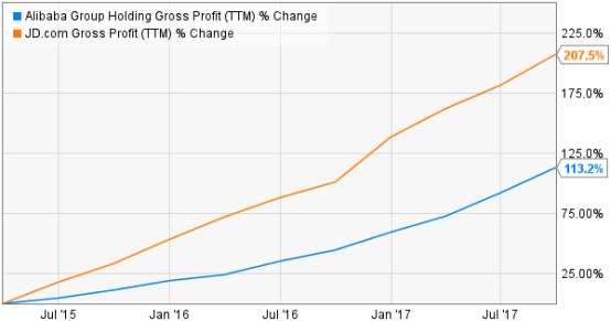 此外,京东的毛利率增速也超过阿里。过去三年中,京东毛利率增速为207.5%,而同期内阿里毛利率增速为113.2%。