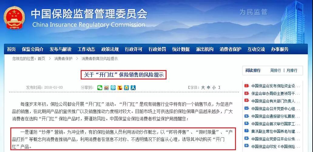 新年第三天,保监会便来了个“反宣传”的温馨提示,提醒各位消费者买“开门红”保险时,要仔细阅读保险条款,提防保险公司的对产品的夸大宣传,不要盲目跟风冲动购买。