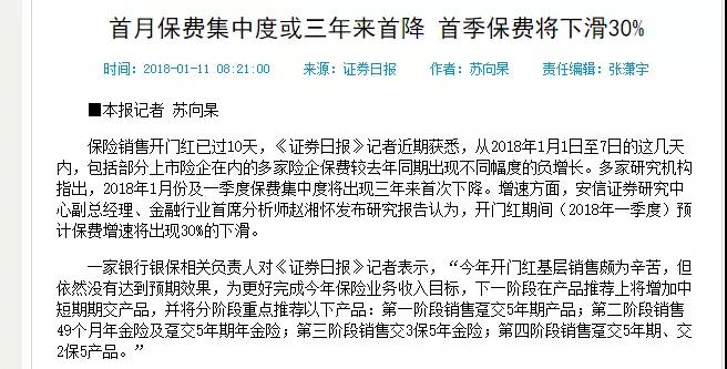 随后,“开门红”战况惨不忍睹的报导接踵而至。从2018年1月1日至7日的这几天内,多家险企保费较去年同期出现不同幅度的负增长,之后更有研究机构指出2018年1月份及一季度保费集中度将出现三年来首次下降。