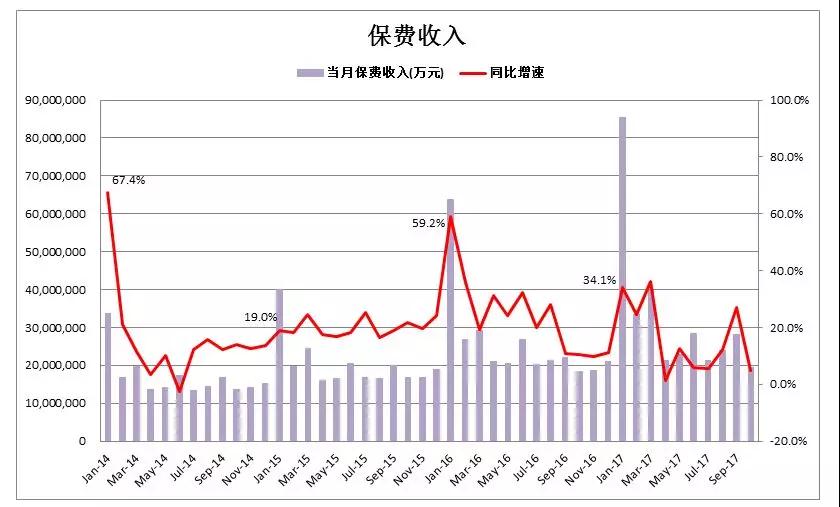 从过往数年看,“开门红”期间的保费增速都非常快。1月份更为明显,2016、2017年1月保费同比增长更是达到59%和34%。