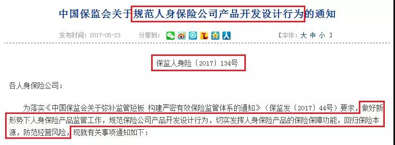 中国保监会于2017年5月推出“134号文件”以规范人身险产品,提出万能险不能再作为年金、两全保险的附加险;保单生效满5年以后,生存保险金才可返还;每次返还不得超过已交保费的20%等不同规定,新规于2017年10月1日实施。