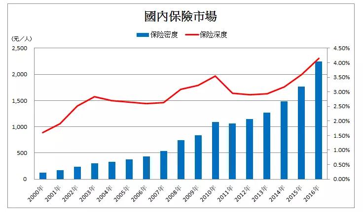 2016年国内保险密度约2,242元/人,保险深度为4.2%,低于美国7.3%和日本10.8%,对比全球水平6.2%显著偏低。