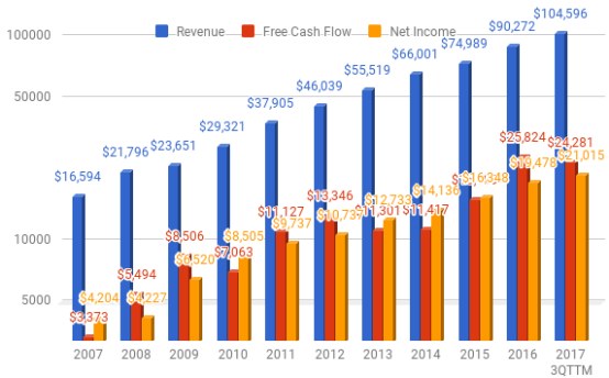 微软和谷歌最近的财报表现都不错,但谷歌的业绩增速更快。2017年第三季度,谷歌的营收和每股收益增速分别为24%和32%,而微软的营收和每股收益分别仅同比增长12%和17%。