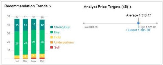 亚马逊出色的股价表现导致许多分析师将不得不下调股票评级使之符合他们之前的目标价,当然笔者认为这不太可能发生,或者是导致分析师上调亚马逊的目标价使之符合他们之前给出的“买入”评级。根据StreetInsider的消息,过去10天里,多位分析师上调了亚马逊的目标价。花旗分析师将亚马逊目标价上调至1400美元,Baird投资管理公司分析师在亚马逊股价为1230美元时将其目标价上调至1310,瑞士信贷、投行Piper Jaffray、Stifel金融以及太阳信托银行分别上调亚马逊目标价至1410美元、1400美元、1425美元以及1400美元。亚马逊上周股价大涨75美元,预计很快还会有更多分析师上调目标价。