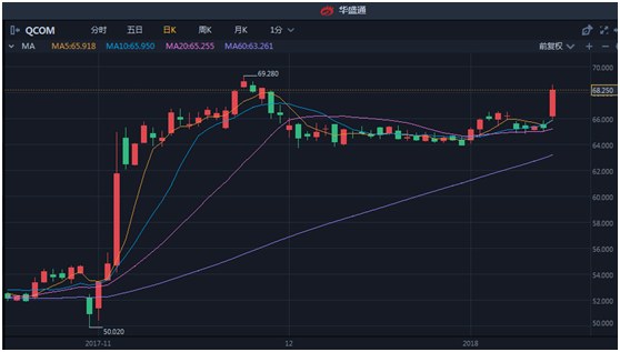 高通公司昨晚声称,公司下一财年盈利将远超华尔街分析师此前预期:预计营收将会达到350亿美元到370亿美元;每股收益将在6.75美元到7.50美元之间,远高于华尔街分析师目前平均预期的3.79美元。受此影响,公司股票昨晚大涨4.39%,股价达到68.25美元。