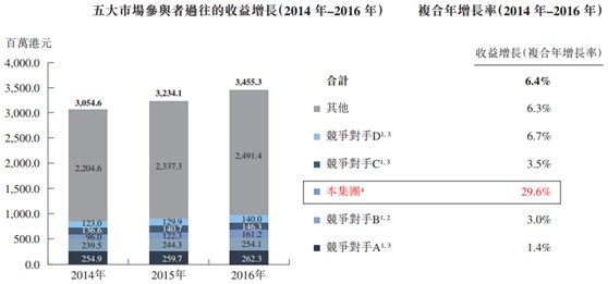 公司2014年至2016年营收分别为1.57亿港元、1.99亿港元和2.49亿港元,净利润分别为2240万港元、3840万港元和4690万港元,年复合增长率达到44.7%;其中2017年上半年公司营收达到1.40亿港元,同比增长21.8%;毛利为6270万港元,同比增长44.8%;净利润为2540万港元,同比增长23.2%。