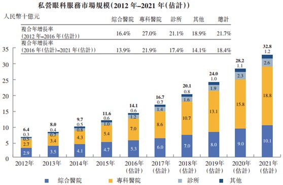 随着城镇生活水平提高及患者人数增加,有机构预计,2012年到2016年,中国私营眼科服务市场收益由64亿元增长到141亿元,预计2021年市场收益奖达到328亿元,期间年复合增长率达18.4%。