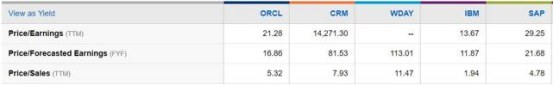 相较Salesforce、Workday、IBM以及思爱普等竞争对手,甲骨文的估值更有吸引力。下图对比了上述几家公司的市盈率、远期市盈率和市销率的表现,甲骨文的市盈率为21.28,仅高于IBM,远期市盈率为16.86,同样仅高于IBM,低于思爱普和CRM。甲骨文市销率在行业中也处于有吸引力的水平。