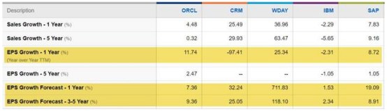 甲骨文的营收增速不够强劲,但公司最近的每股收益及其预期具有吸引力。如下图所示,甲骨文对未来五年的增速预期呈不断增长的态势。