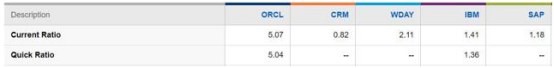 甲骨文的流动比率和速动比率都表现不错,这意味着公司的现金及现金等价物无论是短期还是长期内都较为充裕。
