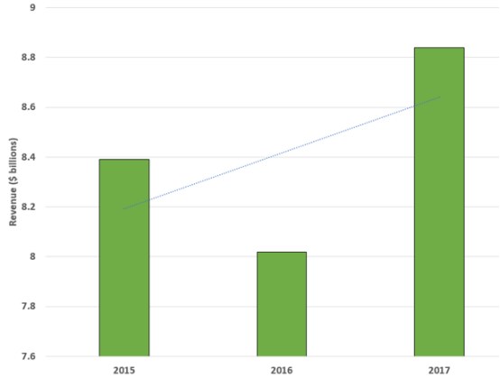 美国运通2017年第四季度营收让人眼前一亮。笔者此前预计的营收为88亿美元,公司实际营收为88.4亿美元,超出笔者之前预期。
