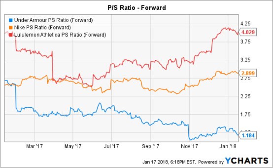 存在分歧的地方在于,在经历了痛苦的促销的一年之后,我们应该如何给安德玛估值。使用传统的收益指标并不会提升估值,因为公司在调整业务模式,以应对突然放缓的增长。那么衡量安德玛价值的最佳指标仍然是销售价格,并假设利润将在2018年开始反弹。此外,该公司是美国减税政策的最大受益者之一,由于国内业务更为集中,其实际税率接近34%。