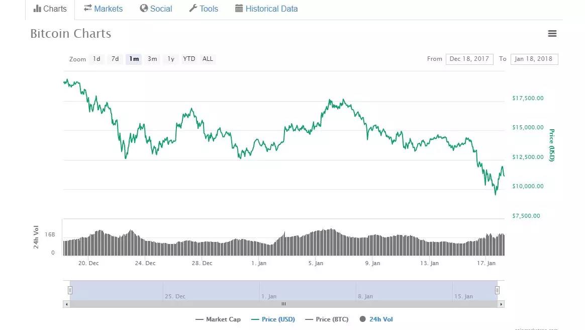 1月18日,比特币创下了单日历史最大跌幅,下跌了20%,跌破了1万美元大关,虽然之后略有反弹,但是现价仍距一个多月前的高点低了近60%。