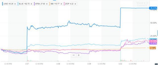 可以清楚的从图中看到,在风筝的收购被宣布后的第一周内,朱诺和蓝鸟的投资回报率都达到了30-40%,而在几个月内投资回报率超过了60%并且在四个月内实现了股价翻倍。
