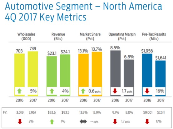福特2017年四季度营收为413亿美元,远远超出分析师平均预期的370亿美元。公司调整后每股收益为0.39美元,比分析师预期的0.42美元低了0.03美元。综合考虑,福特四季度业绩表现还算不错。
