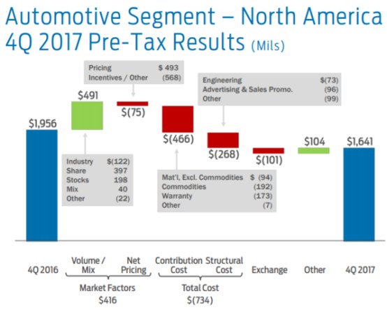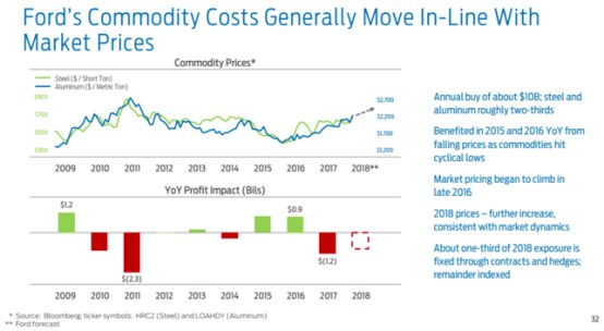 福特认为在商品成本和汇率变动的影响下,2018年公司利润将遭遇逆风。随着美国宏观经济形势继续好转,商品价格会趋于上涨,福特已经深受其害,尤其是金属价格的上涨使公司成本大增。商品价格上涨使福特2017年的利润承压,预计2018年这种情况还会继续下去。