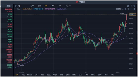 京东上周五晚大涨超6%,股价冲破50美元,创历史新高。近期京东新闻颇多,传物流部门将分拆上市,且日前掌门人刘强东在接受采访时表示,京东将开始国际化战略,将在今年内在美国推出电商平台。刘强东表示将首先在美国华人聚集的洛杉矶城市建立“滩头阵地”,这很明显是要与亚马逊正面刚的节奏。