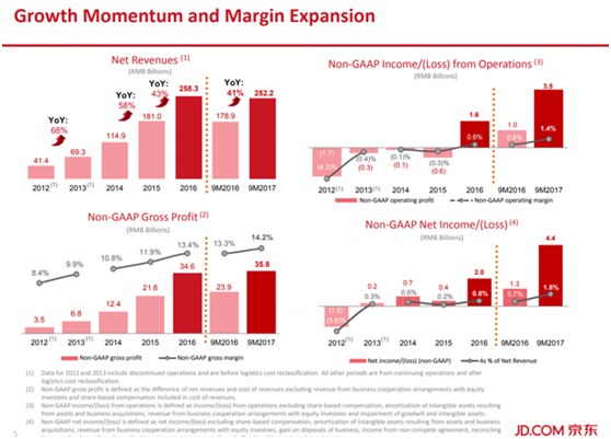 公司去年11月中发布的第三季度财报显示公司同比增速仍然很高,且盈利状况持续改善,显示公司规模效应开始反映。正如公司CFO所言,除去履行开支后的利润同比增长了64%,主要受益于物流仓储等固定成本规模效应。分析师预计美国通用会计准则下,2018年每股收益将达0.38美元。