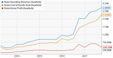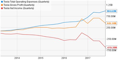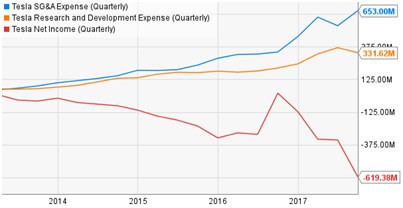 2012年,特斯拉推出了S型,之后2015年公司增加X型,2017年Model 3亮相;但是,一系列新车型所带来的生产成本并没有被毛利所覆盖,因而造成公司净亏损不断增加。