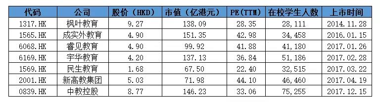 曾几何时,美股是各大教育集团上市的不二选择,这个趋势在去年有所变化。乘着港股史上最强牛市的东风,去年各大教育集团纷纷赴港上市,从年初的睿见教育(6068.HK,以下简称“睿见”)到年末的中教控股(0839.HK),共有5家教育集团实现上市,覆盖学生人数近30万,教育板块中港股上市公司数从2家也增加到7家。多只以“教育”为主题的基金也应运而生,2017年成为了教育板块的“狂欢年”。
