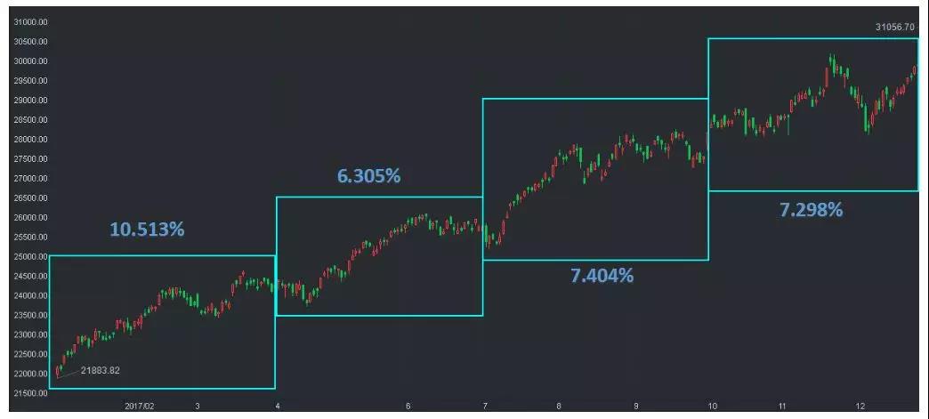 这轮爆升是因为大市比较好吗?我将2017年恒指的涨幅按季度拆分了出来,显然,第三季度的涨幅并非格外耀眼,后期更呈回调走势,完全跟不上教育板块9月的疯狂。