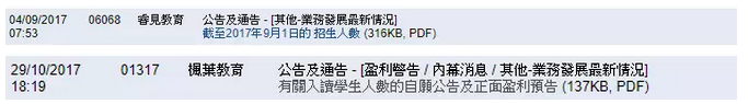 以睿见及枫叶为例,他们去年于9月及10月公布该学年的招生人数,而股价也在附近时间被大幅炒高。