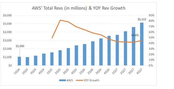 北美地区零售数据亮眼,美国历年节假日季节的销售的弹性都很大。从2015年起,该部分业务的同比增长就超过40%。国际电商业务增长29%,与上个季度的增速基本一致。AWS方面则非常抢眼。下图可以看到云计算业务一直是公司的主力业务,增长高速稳定。