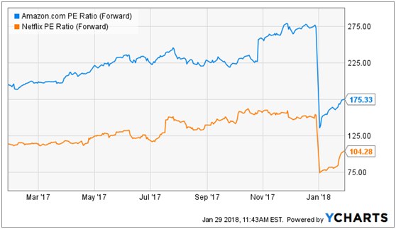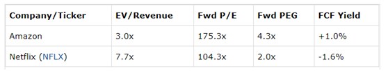 估值上,比较有可比性的大概是奈飞这种公司了。亚马逊动态PE 175x左右,比奈飞的100x还高出不少,从EV/Revenue的角度看,比奈飞便宜。