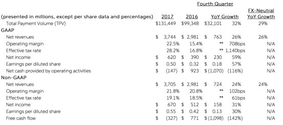 下图显示了Paypal四季度财报的部分数据,可以看出公司四季度业绩表现十分出色。