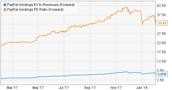 如上图所示,按照公司2018年的预期每股收益计算,公司远期市盈率在33左右。Paypal的企业价值与营收比率为5.85。投资者对eBay事件反应过激,导致股价下跌,再结合市盈率和企业价值与应收比率来看,Paypal的估值并不算太高。