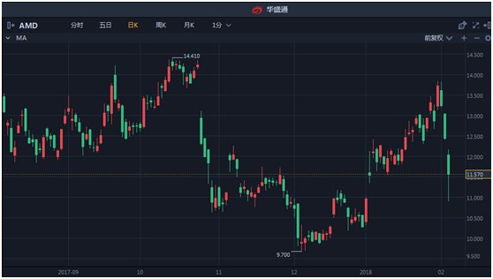 但是,由于此前数字货币的火爆,造成了公司股价在一定程度上有所高估,公司的远期市盈率明显高于业内平均水平,因此,即使公司爆出了较好的财报,但是AMD短期内也面临抛售压力,根据下图可以看出,公司在发出财报后,进入2月份3个交易日,连续下跌,总跌幅超过15%,所以投资者需要在重回上涨趋势前保持耐心。