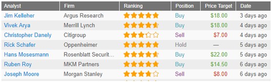 虽然短期公司股票有所回落,但是卖空者没有得到分析师的支持,从下表可以看出,只有两位分析师给予公司“卖出”评级,其中一位是来自花旗集团的Christopher Danely,他给予公司目标价仅为7美元;另一位则是来自摩根士丹利的Joseph Moore,他给予公司的目标价为8美元。与此相反,绝大多数分析师还是一致看好AMD的股价,其中有目标价达到22美元。